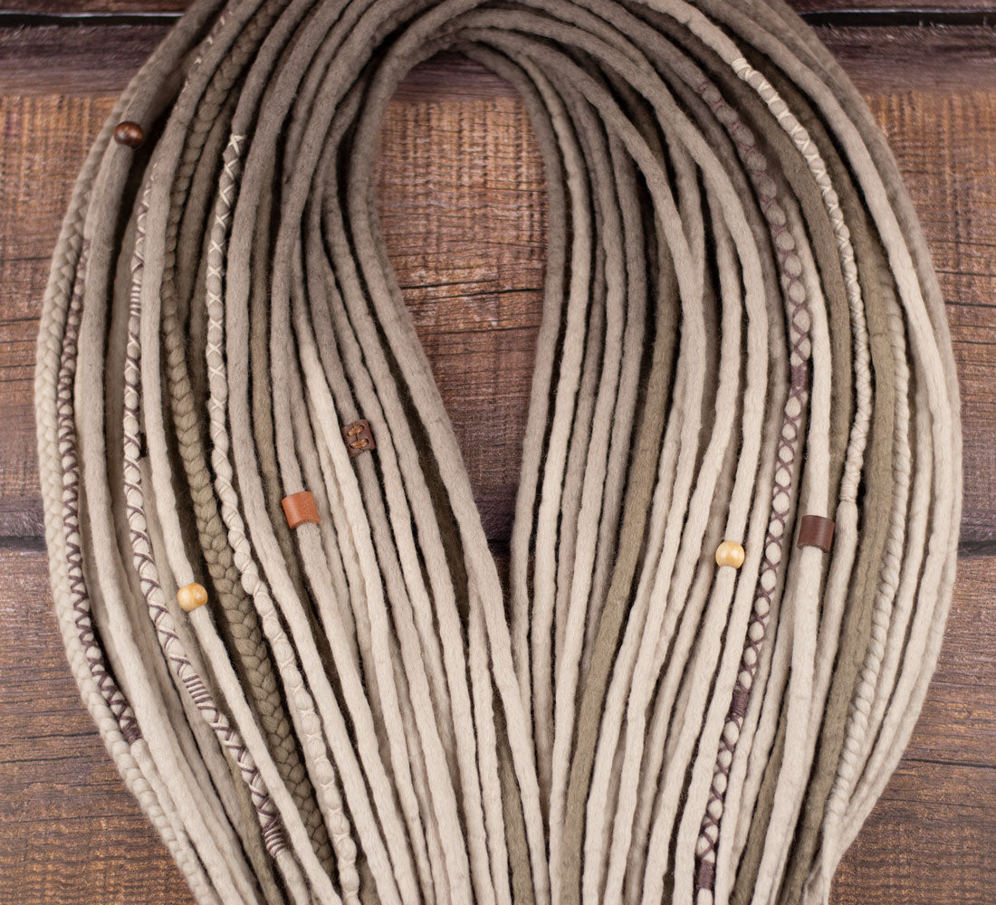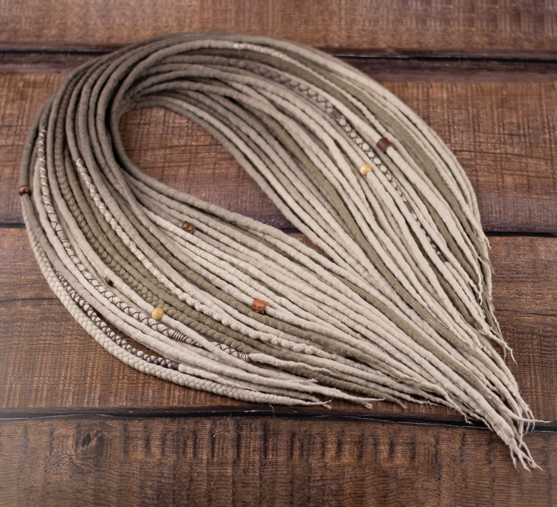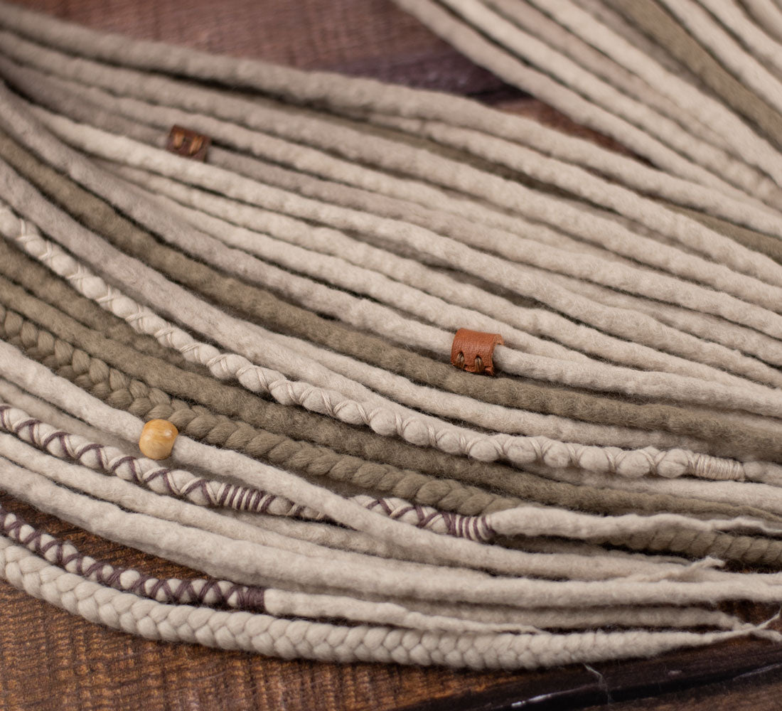 The set features simple wool dreads with braids, genuine leather, and wooden beads. Decorated with cotton yarn for an earthy, tribal look.