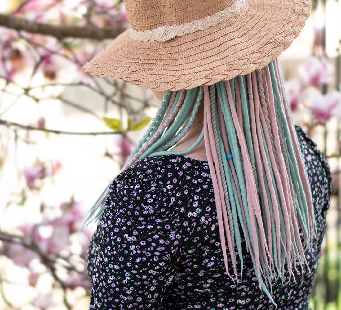 Pastel-colored wool dreads radiate a sense of joy, calm and positivity. They evoke images of soft spring flowers, cotton-candy skies and carefree summer days. By incorporating these mint and shell tones into your hairstyle, you can add a light and cheerful mood to your look. The pastel wool dreadlocks with Chinese jade crystal become part of your personality, allowing your individuality to stand out from the crowd and convey a positive energy that can lift your mood and those around you.