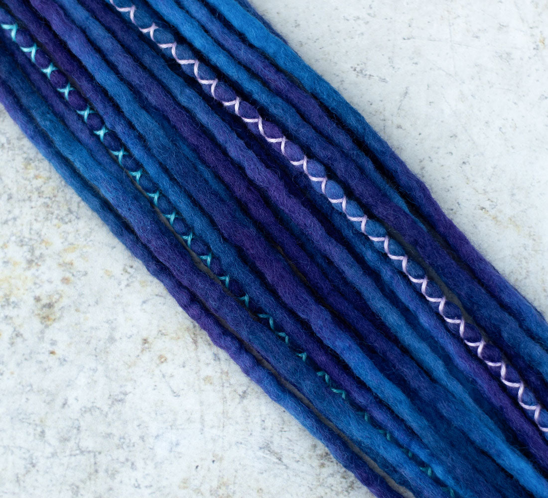 Handmade wool dreadlocks guarantee an authentic look as they vary slightly in thickness and length. We use high-quality mulesing-free fine merino wool for dreads. The dreadlocks are decorated with cotton yarn. We make the dreads with wet felting technique and dye by hand.