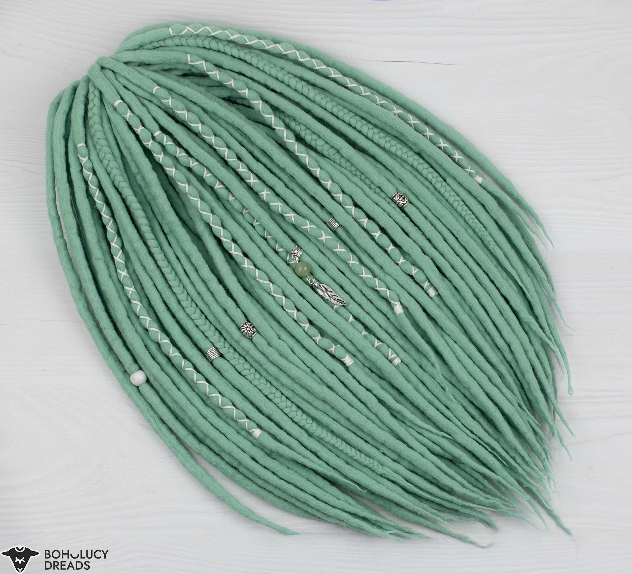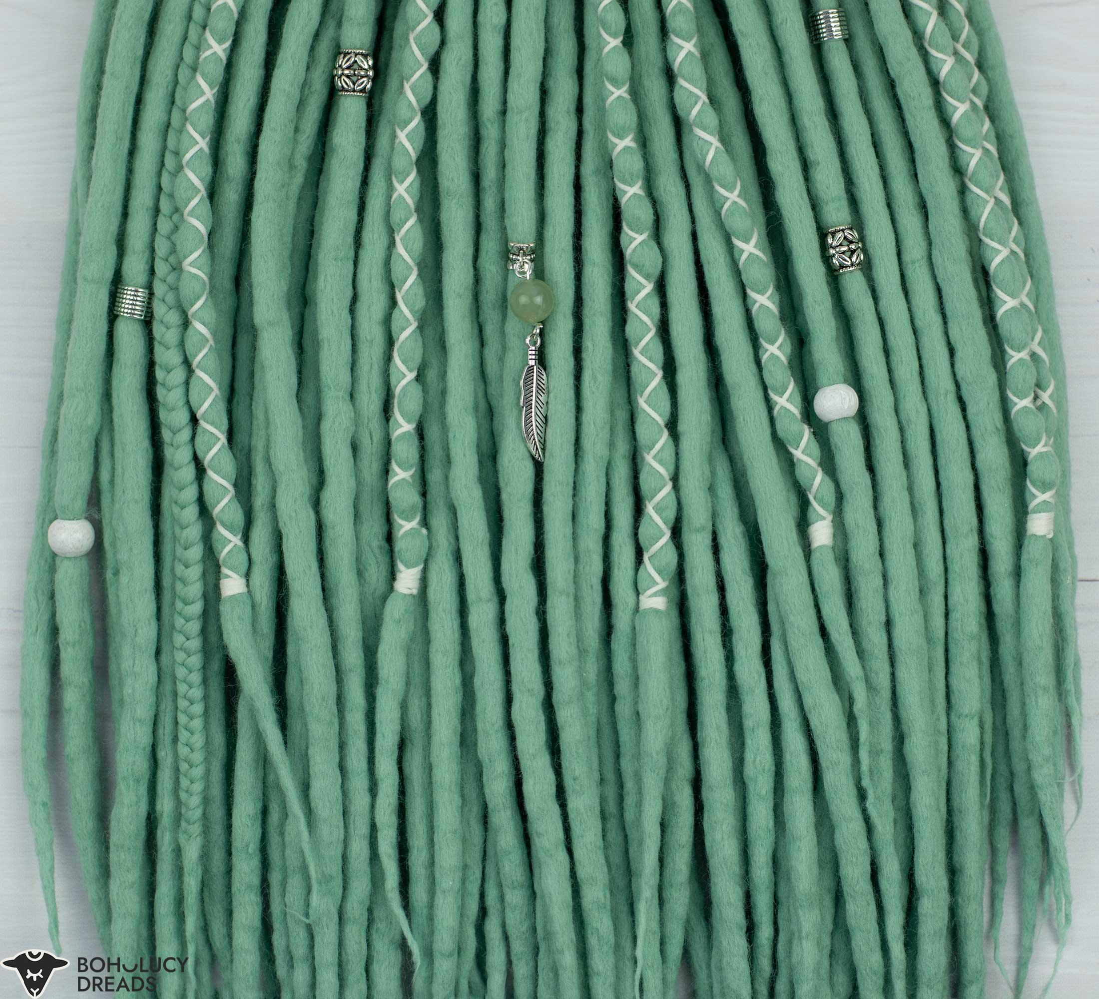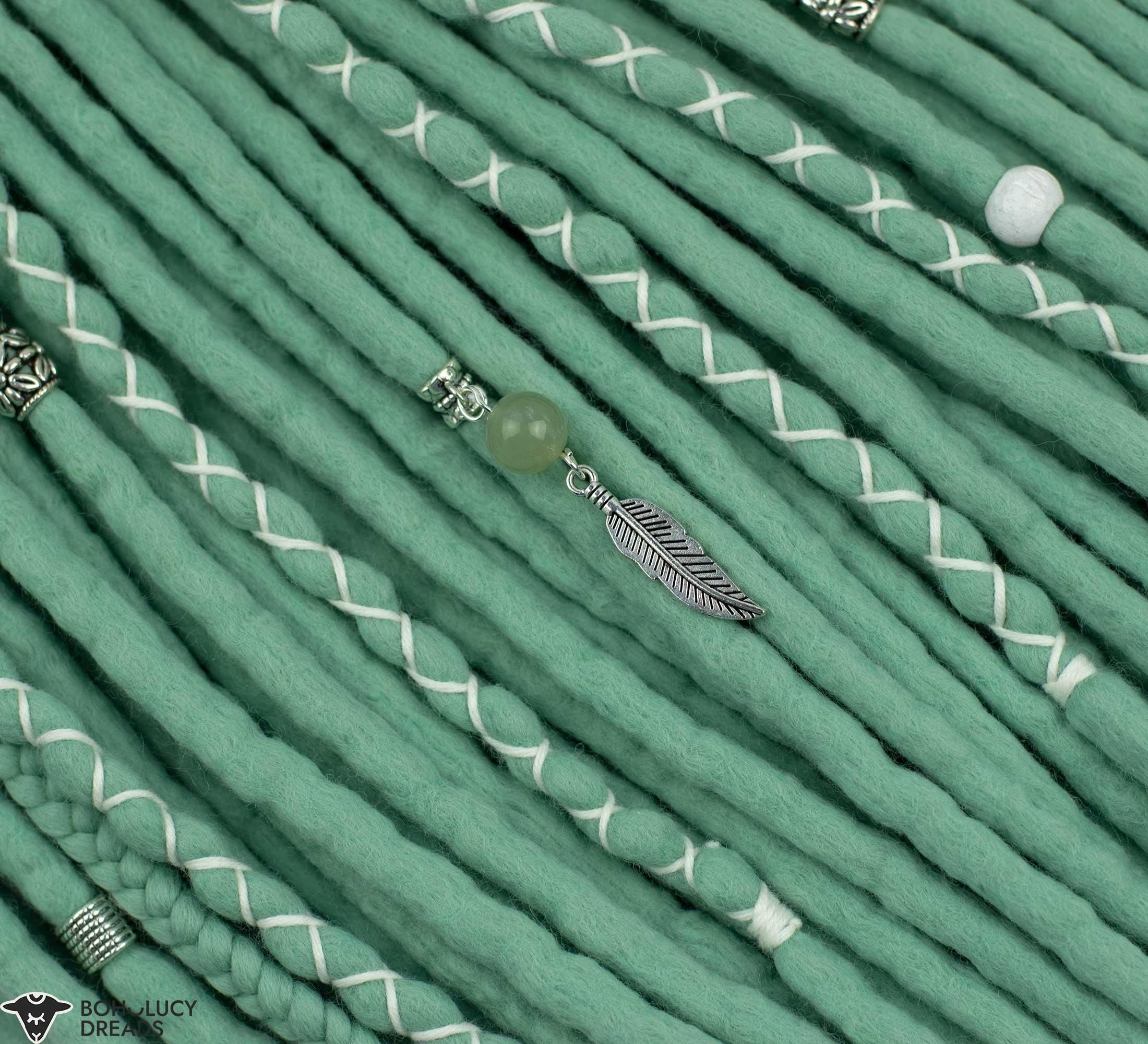 Our mint pastel wool dreadlocks offer a vibrant and unique way to express yourself while enjoying the wonderful properties of wool. These bohemian hair extensions are popular with individuals seeking a playful and positive look. The combination of pastel-colored wool and the dread beads with Chinese jade crystal creates a glamorous aesthetic that resonates with you.
