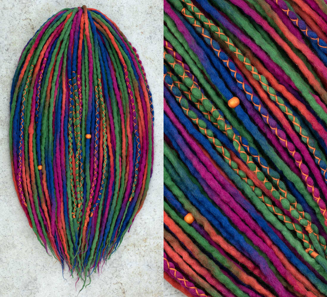 The mill dyed wool and yarn is toxic free, and complies with the OEKO-TEX 100 and GOTS requirements. We use high quality mulesing free fine merino wool for dreads. The dreadlocks are decorated with cotton yarn. We make the dreads with wet felting technique.